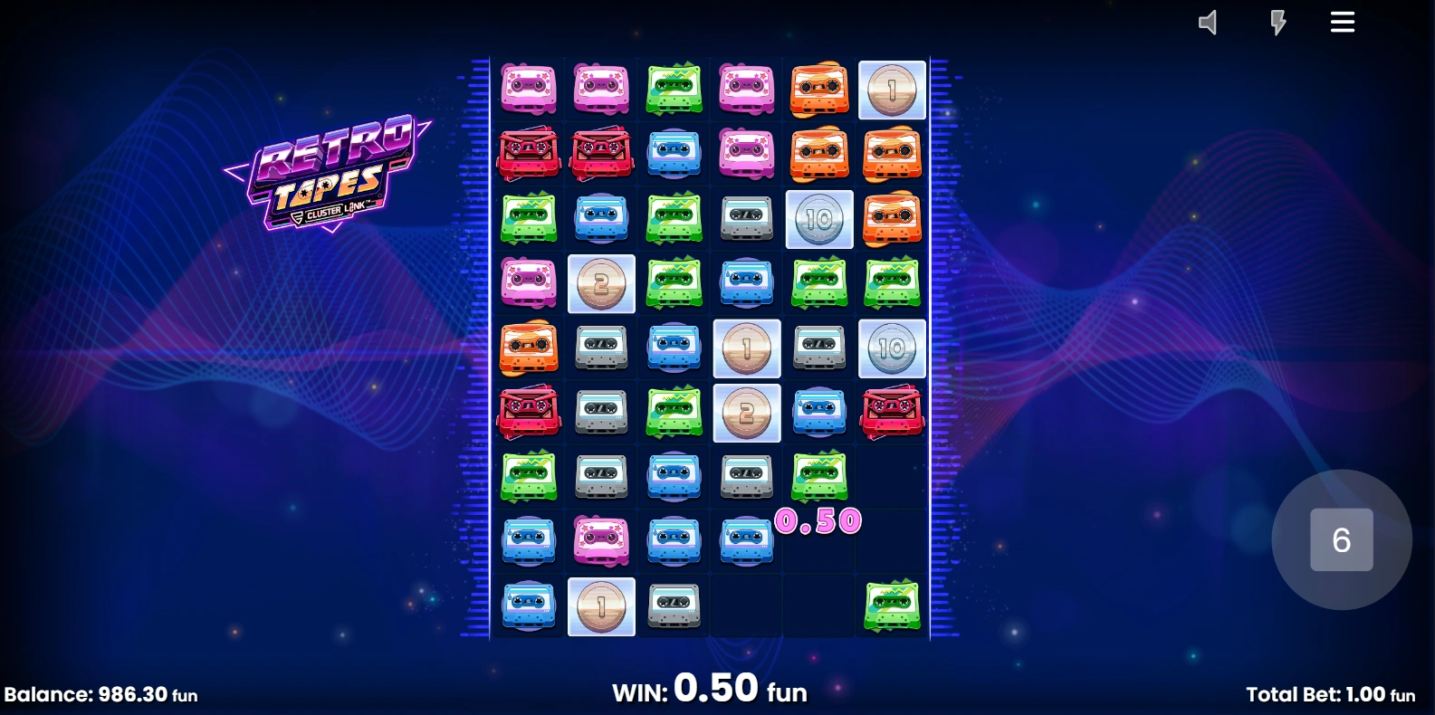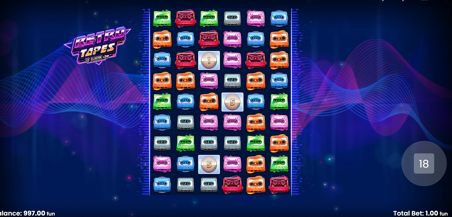 Retro Tapes 2 is built around a modern grid-based gameplay system where cluster wins replace traditional paylines. Instead of matching symbols across fixed lines, players win by forming clusters of identical symbols that connect horizontally or vertically on the grid. This structure allows wins to appear anywhere on the board rather than following predetermined patterns.